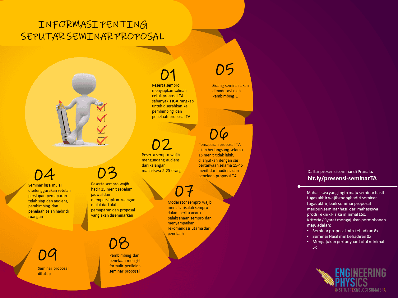 Mahasiswa yang ingin maju seminar hasil tugas akhir wajib menghadiri seminar tugas akhir, baik seminar proposal maupun seminar hasil dari mahasiswa prodi Teknik Fisika minimal 16x. Kriteria / Syarat mengajukan permohonan maju adalah: Seminar proposal min kehadiran 8x Seminar Hasil min kehadiran 8x Mengajukan pertanyaan total minimal 5x